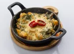 Куриная грудка с шампиньонами, картошкой и луком в сливочном соусе, запеченная под сырной корочкой