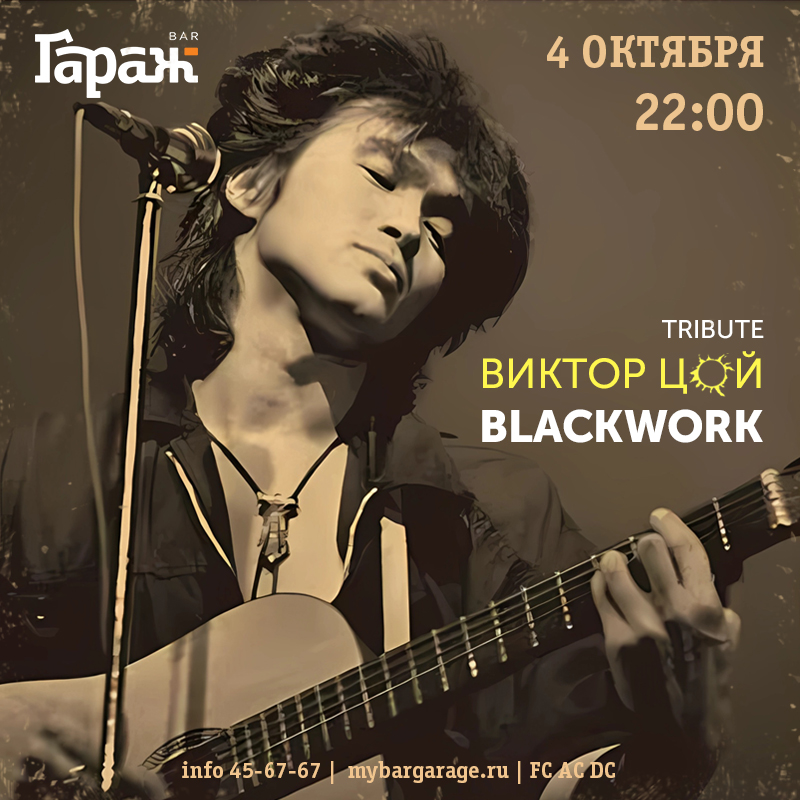 04.10.2025 — Blackwork. Трибьют В. Цоя Крутая банда BLACKWORK возвращает легенду! Знаковые хиты из репертуара культовой группы "КИНО". Ждем всех, для кого Цой не просто поэт и музыкант, а символ эпохи. Приходите петь вместе с нами! Цой жив! Резерв Все мероприятия Скачать эту афишу