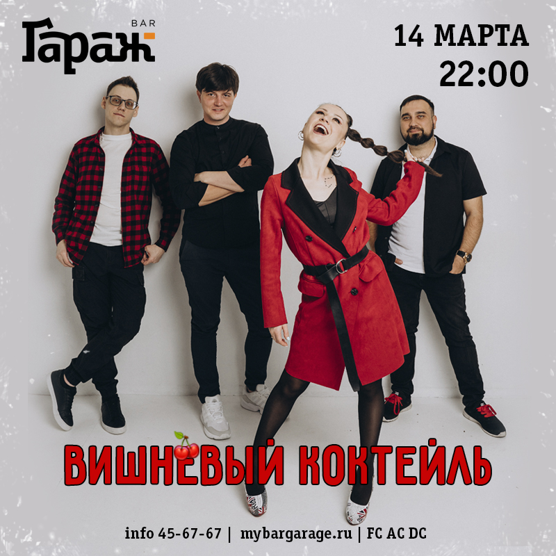 Порция вишнёвых витамин от этой заводной банды непременно поднимет настроение, повысит тонус мышц на танц.поле и укрепит уставший за рабочую неделю организм. Принимать Вишневый Коктейль рекомендуем регулярно баре Гараж в 22:00. Случаи передозировки не зафиксированы)